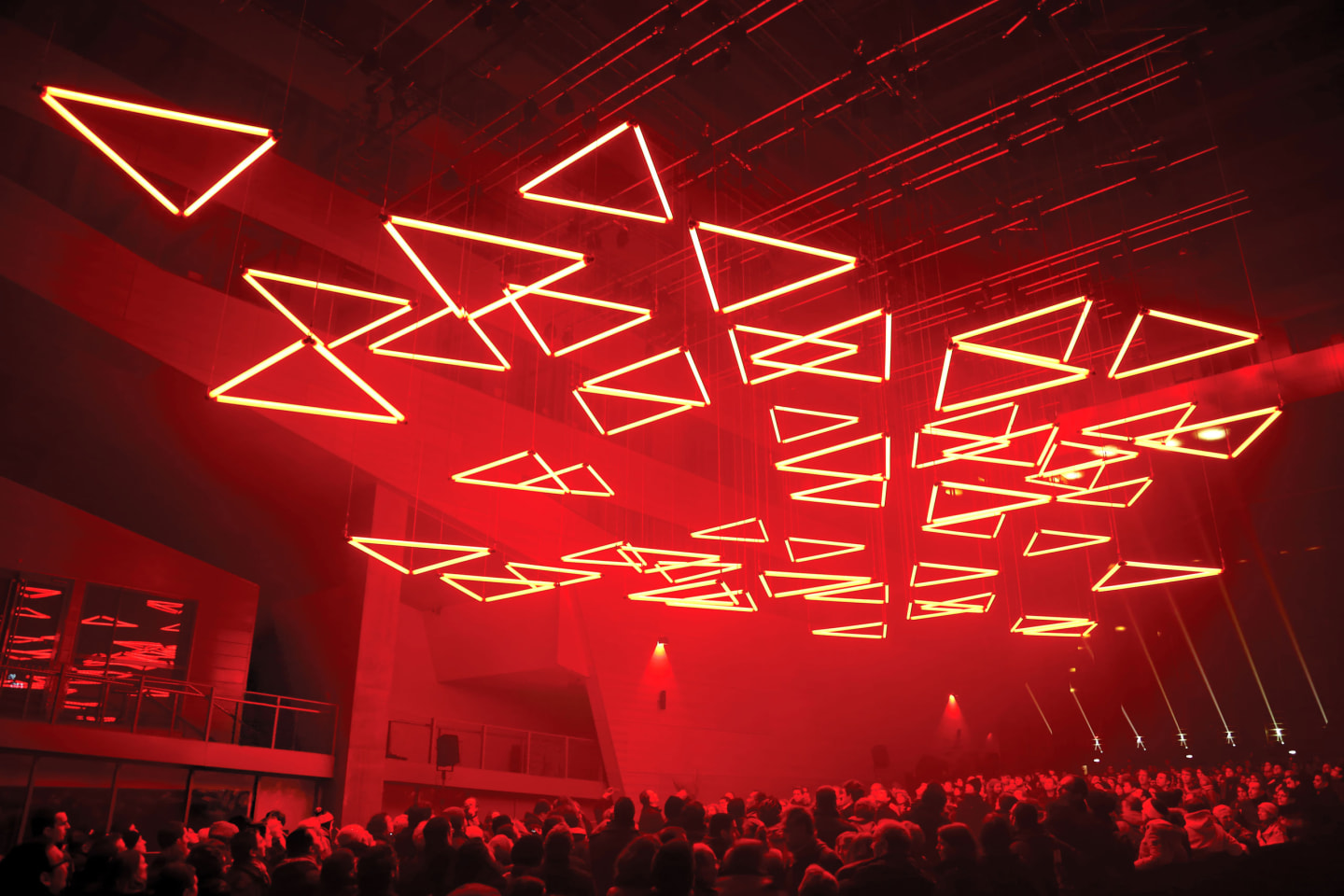 Christopher Bauder: Both [my collaborator] Robert Henke and I came out of Berlin’s clubbing underground, going to parties and enjoying the visuals. Robert, as you know, basically created today’s Berlin underground or experimental sound with Ableton, where he is one of the two founding fathers. Most of the rooms in DARK MATTER represent my roots, as well as the future of where this can go. I mean, Berlin clubs are very understated, you know, like not too many flashing lights and very reduced. And it’s not about the lighting. It’s not about the music. It’s about the sound and the dancers and all those things, which I love.