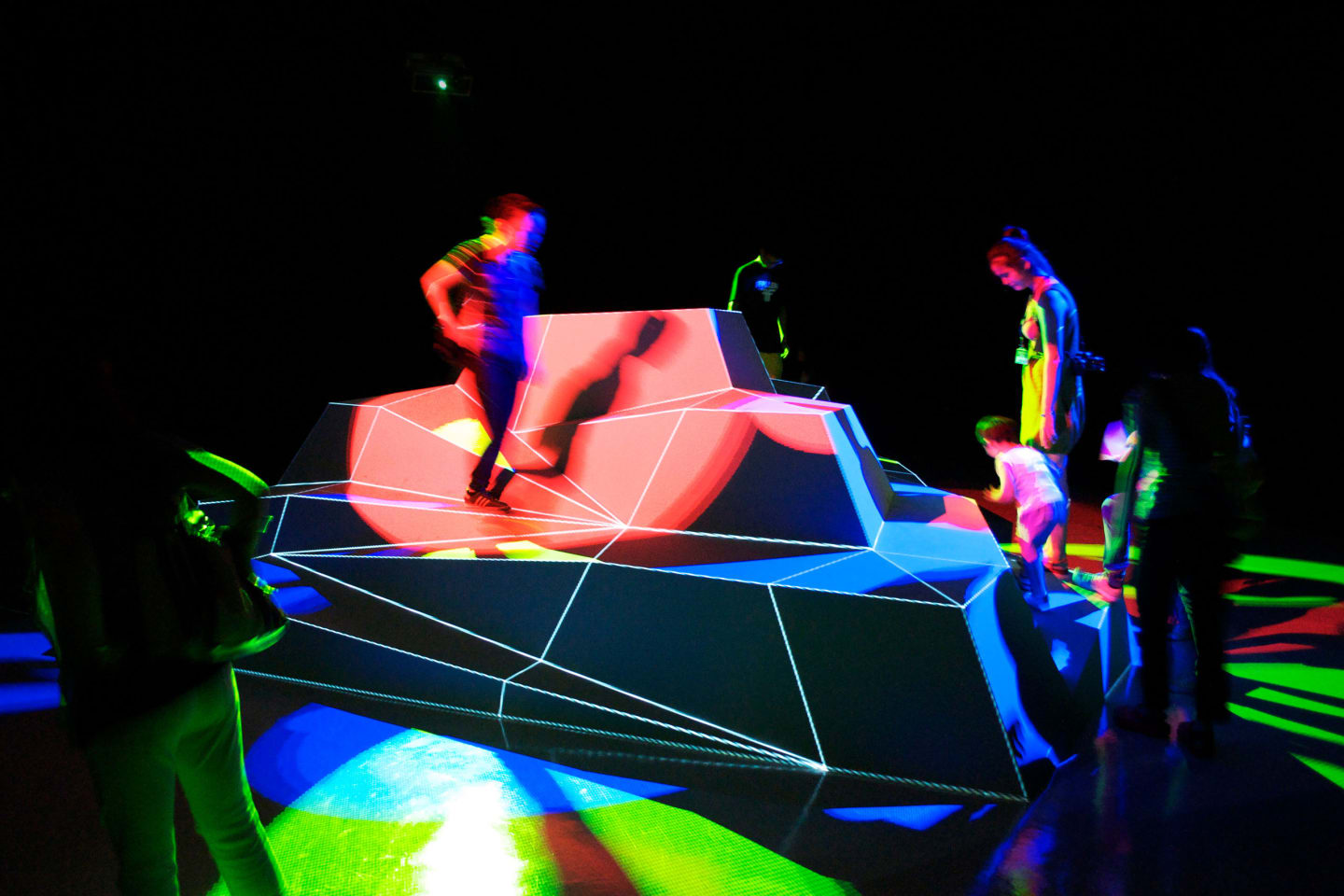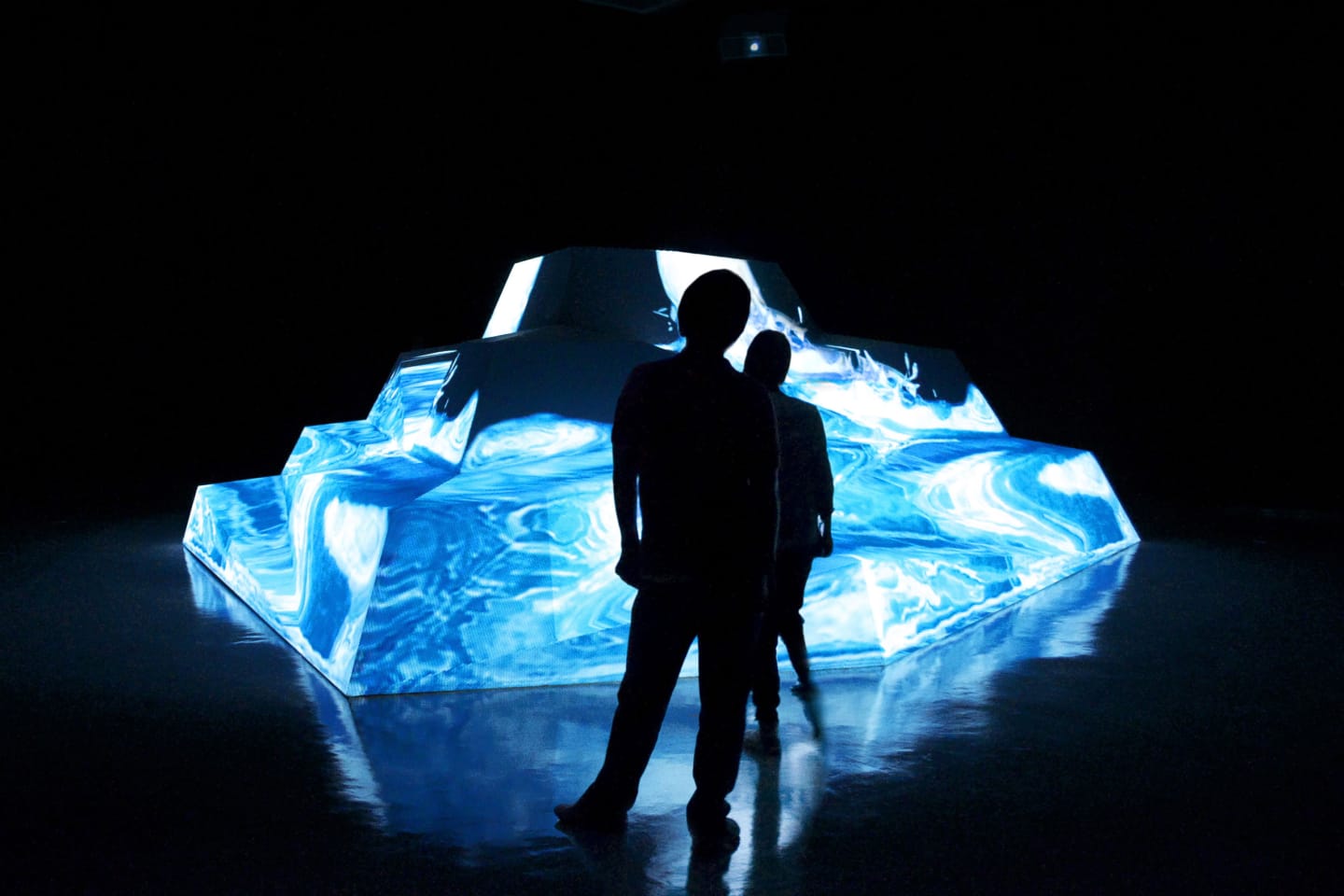 And then we have adaptations of some pieces. For example, the POLYGON PLAYGROUND, my first interactive projection mapping piece from 2007, which we have updated with the possibilities of modern generative real-time environments. We have totally different graphical possibilities of what we can project and how we can interact with it, so we’re bringing that to a new level. There’s also the BONFIRE installation, which is a very meditative room where you basically just sit around a gigantic fire made from LEDs. LIQUID SKY is a kind of variation on the product we once created for Philips. That’s one of the last pieces, and it’s in the mirrored room, presented in the same way as in 2012 in an exhibition in Paris where the whole room had mirrors on all sides. So you have this endless feeling of being underwater and looking up at the surface of a sea or a starry sky or something like that.
