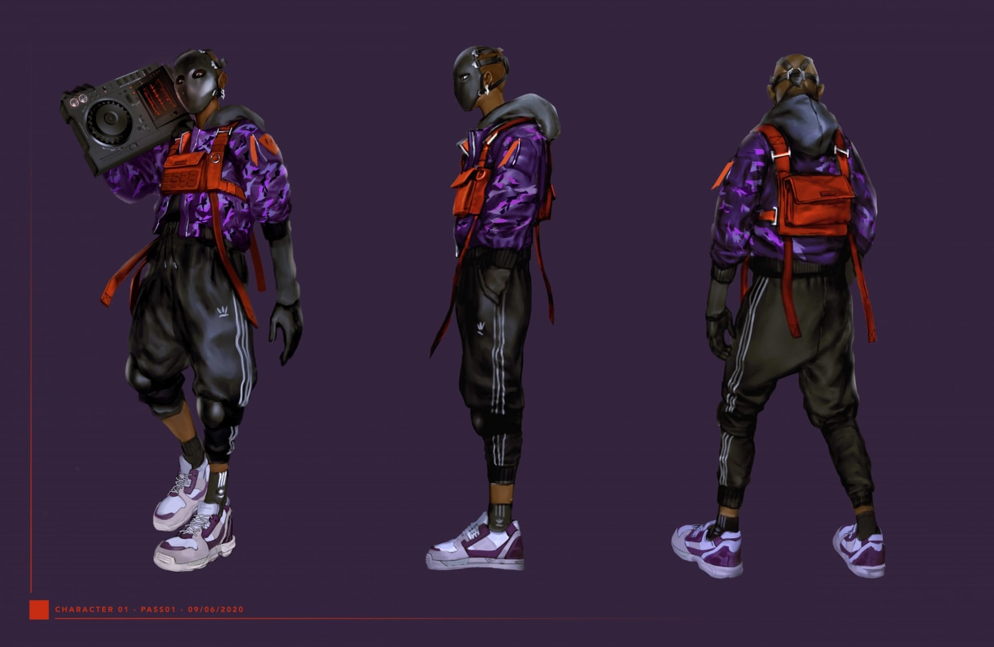 Nodding to the young, screen-savvy demographic to which he belongs, Koomson replicated a pale “digital” purple from the 3D rendering program Blender as the shoe’s base tone with darker purple accents. The colors white and black have been too overdone, he tells me, and orange, his second favorite, was “maybe too brash.” The sneaker itself, the ZX 8000, is a Bundeswehr leisure trainer and came about thanks to Koomson’s near-archival knowledge of Adidas’ history. “From the internal information, I knew there was this type of white label model that the company made for the German army,” he says.