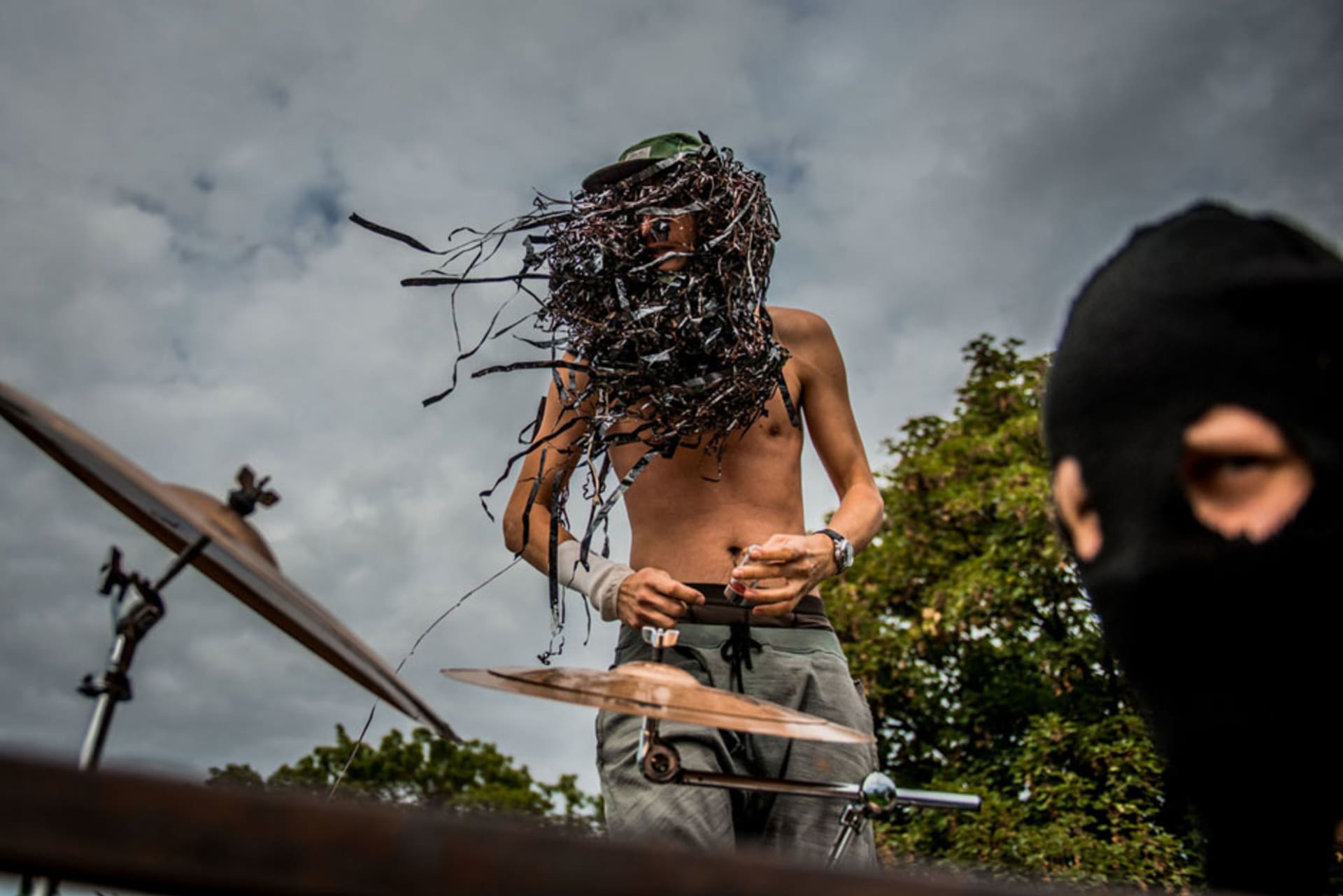 BNNT is the brainchild of Konrad Smolenski, a visual artist and performer from Poznan, known for his activity in experimental art-music group KOT, or in countless music projects (such as NGNP, Sixa, Radar, Kristen, or the hip-hop act Czykita). Here, he ‘plays’ his self-constructed instrument—a Gagarin era missile-shaped rocket with hidden strings, a home-cobbled guitar-machine. With his partner on drums, they create a curious mayhem—rarely do you see an audience so obviously ill at ease as during their concerts. Some music journalists dismiss it, as to them ‘this is not really music anymore’ – they see it as artistic curiosity, without proper knowledge of music. Yet BNNT obviously figured it out musically: the frantic drumming is structured and so is Konrad’s missile-playing. Yet it’s all about presence and performance. Their music may appear macho and hooligan on the surface (two menacing, half-naked men in a tribal get-up, wearing balaclavas), but the actual sound has more to do with punk/hardcore/mathrock DC bands, from Don Caballero to Shudder to Think. Some also draw comparisons to Lightning Bolt. Their apparent facelessness (Konrad wears a woven ‘totem’ of cassette tapes on his face) and anonymity holds a paradox—this increases their visibility. The gigs, hosted both in galleries and music venues last from fifteen minutes to over a hour, and in general, remain wildly unpredictable.