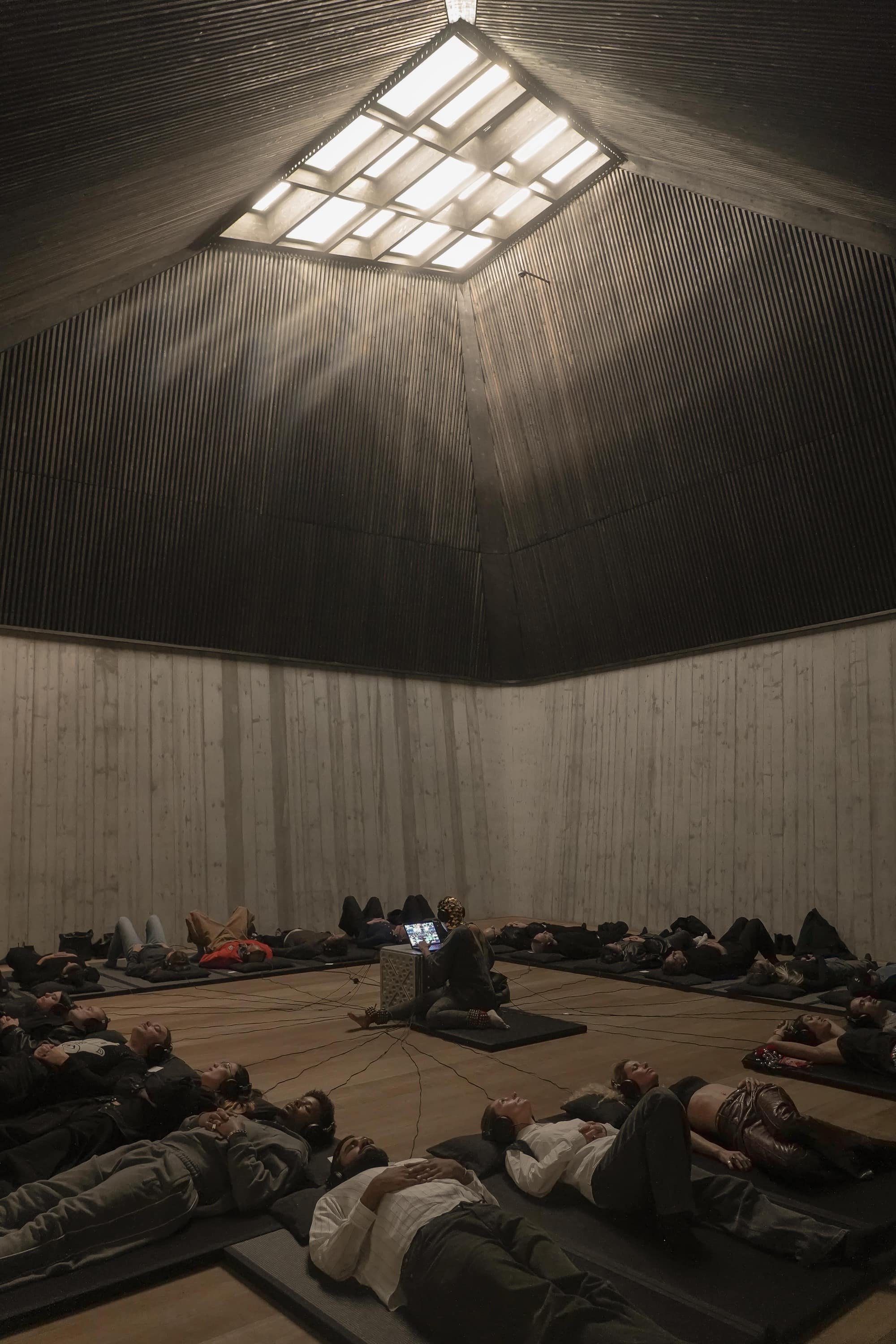 Erykah Badu sat in the centre of a wire web, twenty-five of us radiating outward with headphones on, when she gave us the concluding orders. "Focus, she said. "For the rest of the way." Badu, aka Badulla Oblongata, aka Sara Bellum, aka Analogue Girl in a Digital World, aka SHE ILL, is the queen of alter egos and godmother of soul who has collected accolades and commanded stadiums throughout the course of her three-decade career. In the middle of the cavernous room was a steel cube, where she played on her laptop as we laid on black tatami mats around her and became immersed in her world.