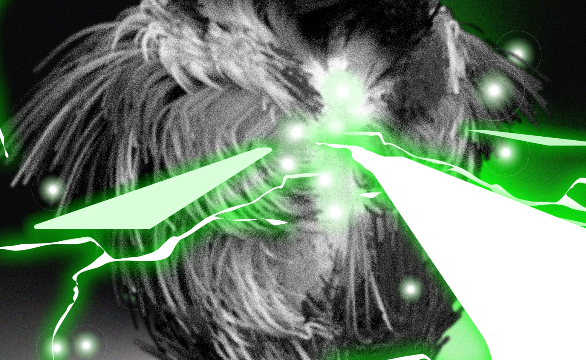 Ann Kern’s visual piece accompanying the track embodies Mafou and Somatic Rituals’ marriage of traditionalism and modernity, as evident in the contrasting textures between the hazy, monochrome figure in the background and the sharp, confrontational flashes of colour. She takes her inspiration from the “dynamics of dancing” of the Kankourang’s annual ceremony, an initiation rite native to the Senegambian region, in which the protagonist Kankourang wards off evil spirits by patrolling their village, leading the citizens in singing and dancing, as well as chasing the younger citizens through the streets. Kern’s piece taps into that feeling of “being chased, or being the chaser,” with the intense movement of the piece visualizing the Kankourang’s flight.