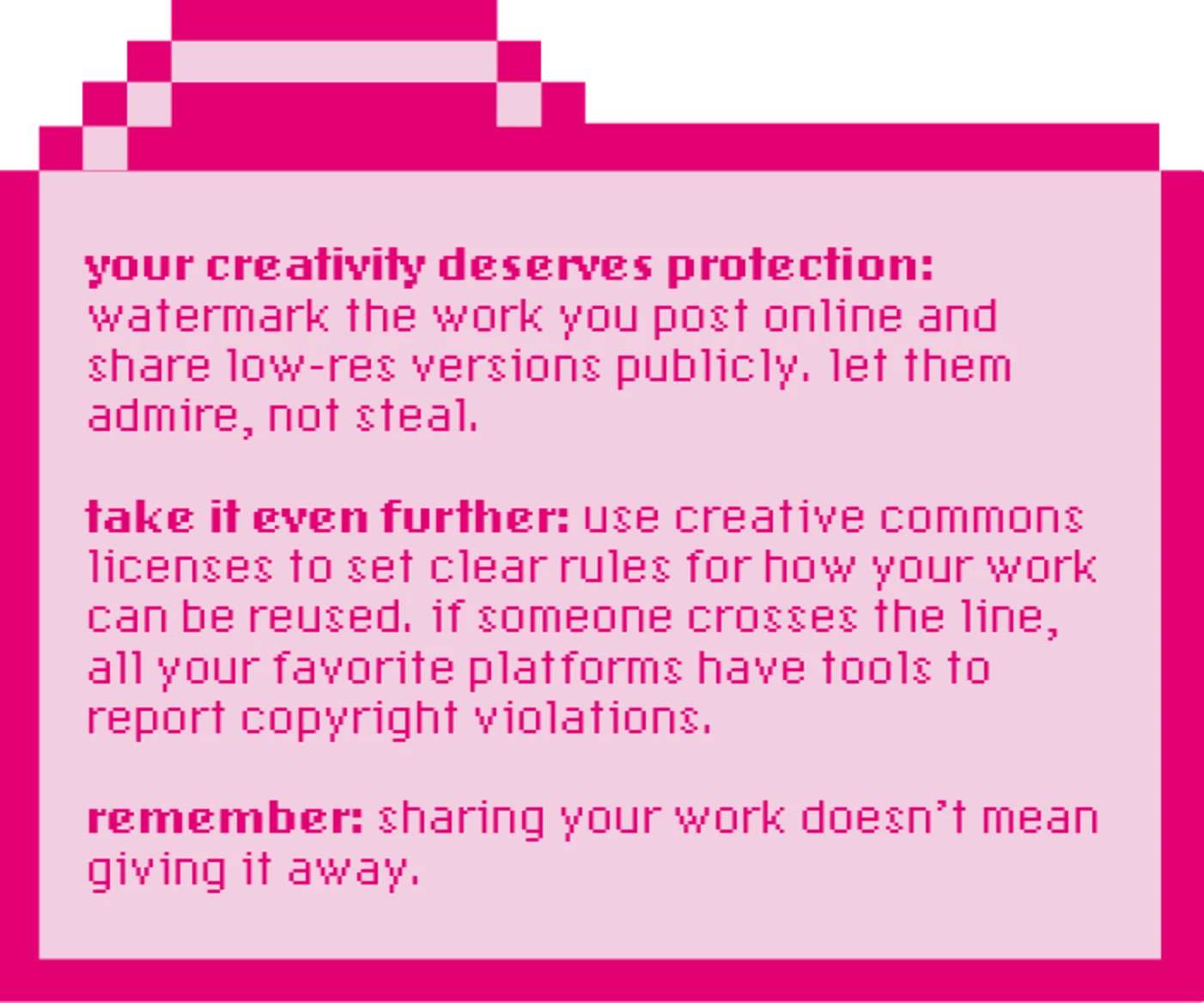 Only post low-res previews: Don’t post everything in full quality. Keep the originals. Share screenshots, low resolution versions, or snippets when possible. Just enough to get a taste of your creations, without giving it all away.