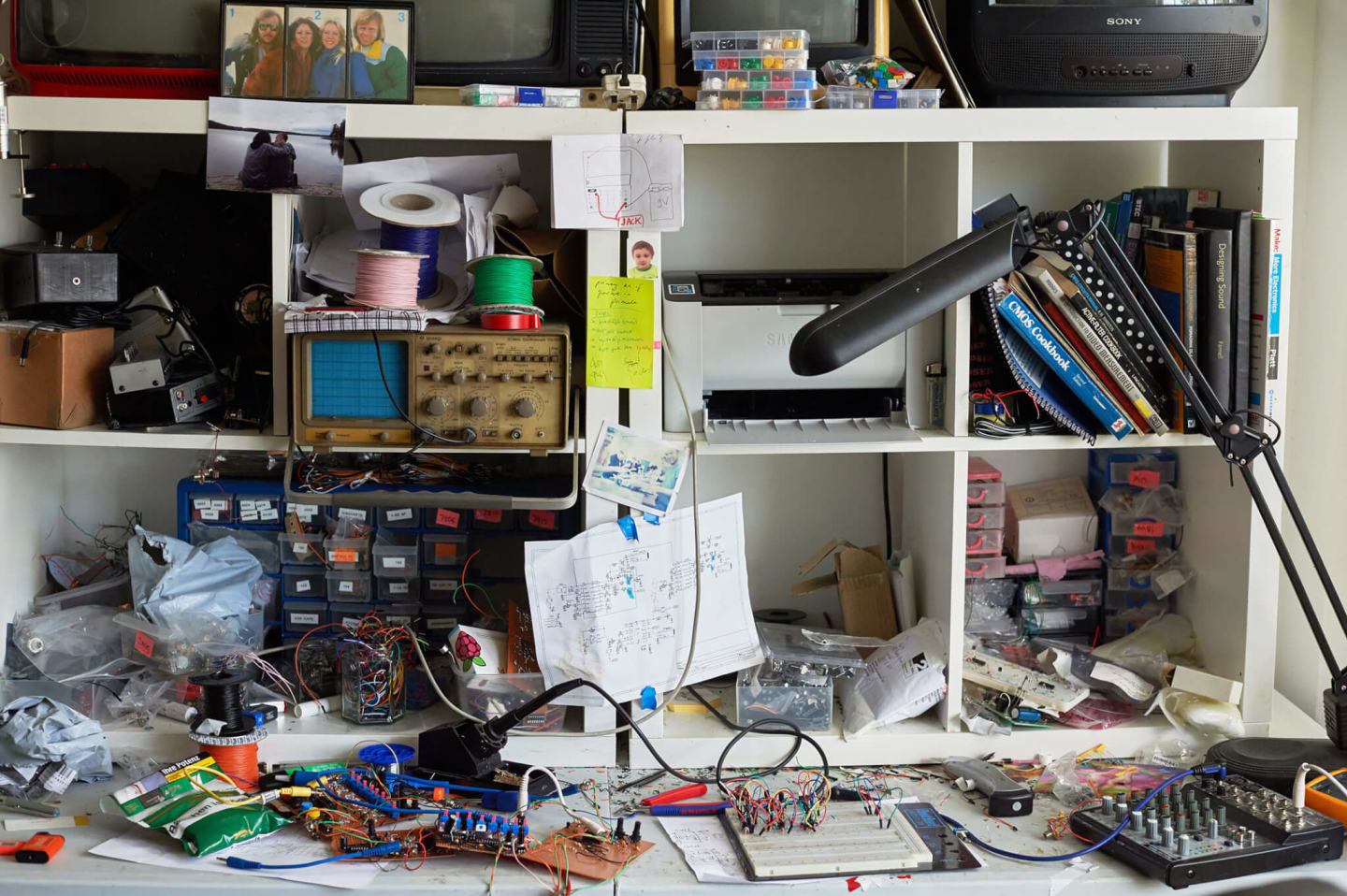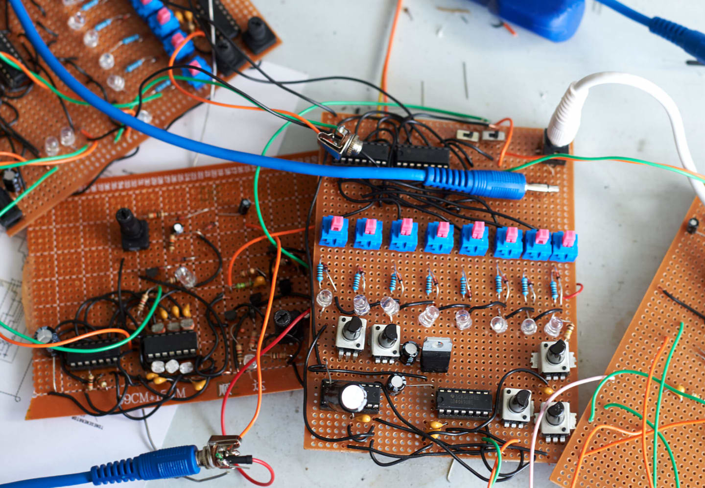 I have 13 different instruments on my online shop, which includes a patchable sequencer and several noisy synths that contain lightbulbs and shitloads of LEDs. Then I have a whole box full of circuit boards that were once projects that I gave up on. I started soldering them and I decided, “This isn’t working,” or “I don’t like it.” I have a lot of half-finished pieces like these because I like to breadboard things for a while before I start to build them. A breadboard is a kind of circuit board used for prototyping, so you can take components out and then put them back together to see what happens before committing to a design.