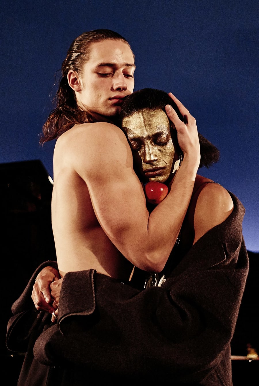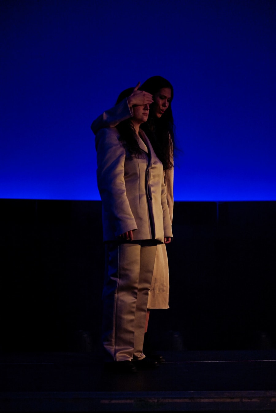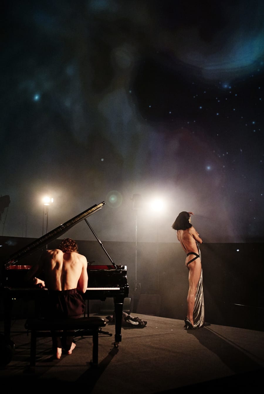 The night’s first performer, dancer, model, and choreographer MJ Harper, began their performance Act 1, alongside David Jainz, with a slowly-addressed series of musings about fear, control, and intimate relationships that quickly ratcheted up into near unintelligible speeds that felt like their brain was short circuiting. After this brief moment of anxious tension, the mood shifted into a more somber space, where Harper’s slow, soft movements and hushed spoken word conveyed fragility and vulnerability, while their only accompaniment, a live pianist, further amplified every emotive movement with a string of Romantic period compositions. After a penultimate fade-to-black, the performance ended with the loving embrace of a pre-recorded, string led love song.