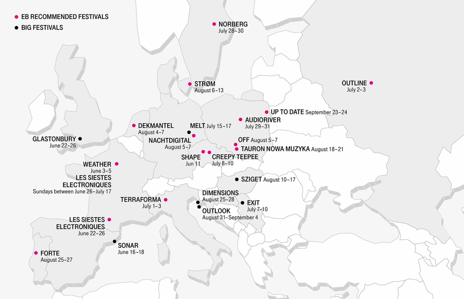 On the other hand, we strongly recommend you note the pink dots, as those mark the spots of European summertime events between June and August (plus one in September) that we’re truly keen to experience (or those that we’re working with in Poland). We’re planning our trips to Italy to chill at experimental music retreat Terraforma, to the Czech Republic for longtime EB favorite Creepy Teepee and a one-night SHAPE program event at Prague’s MeetFactory and to Moscow to attend the day-long madness that is Outline. And, of course, you’ll find us at the increasingly critical semi-underground conventions in Paris (Weather) and Amsterdam (Dekmantel).