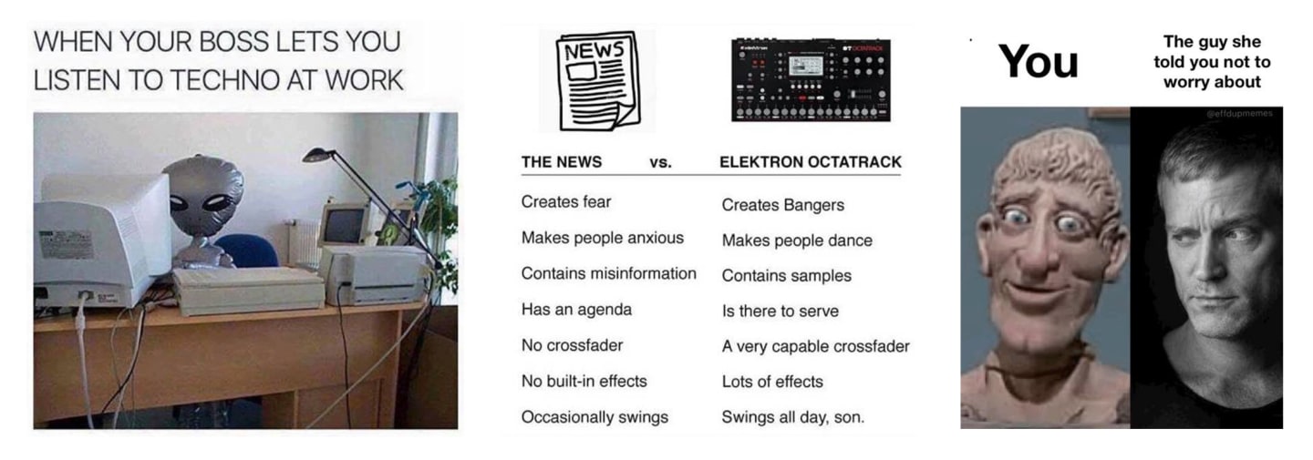 The Worst Techno Memes Ever Group Page is a humble community of techno fans—plus a few DJs—who aren’t afraid to laugh at themselves and club culture at large. Committed to scouring the internet for the absolute most cringe-worthy techno-related content, the page is a quickly-growing group of electronic music fans trying to take themselves just a little bit less seriously.