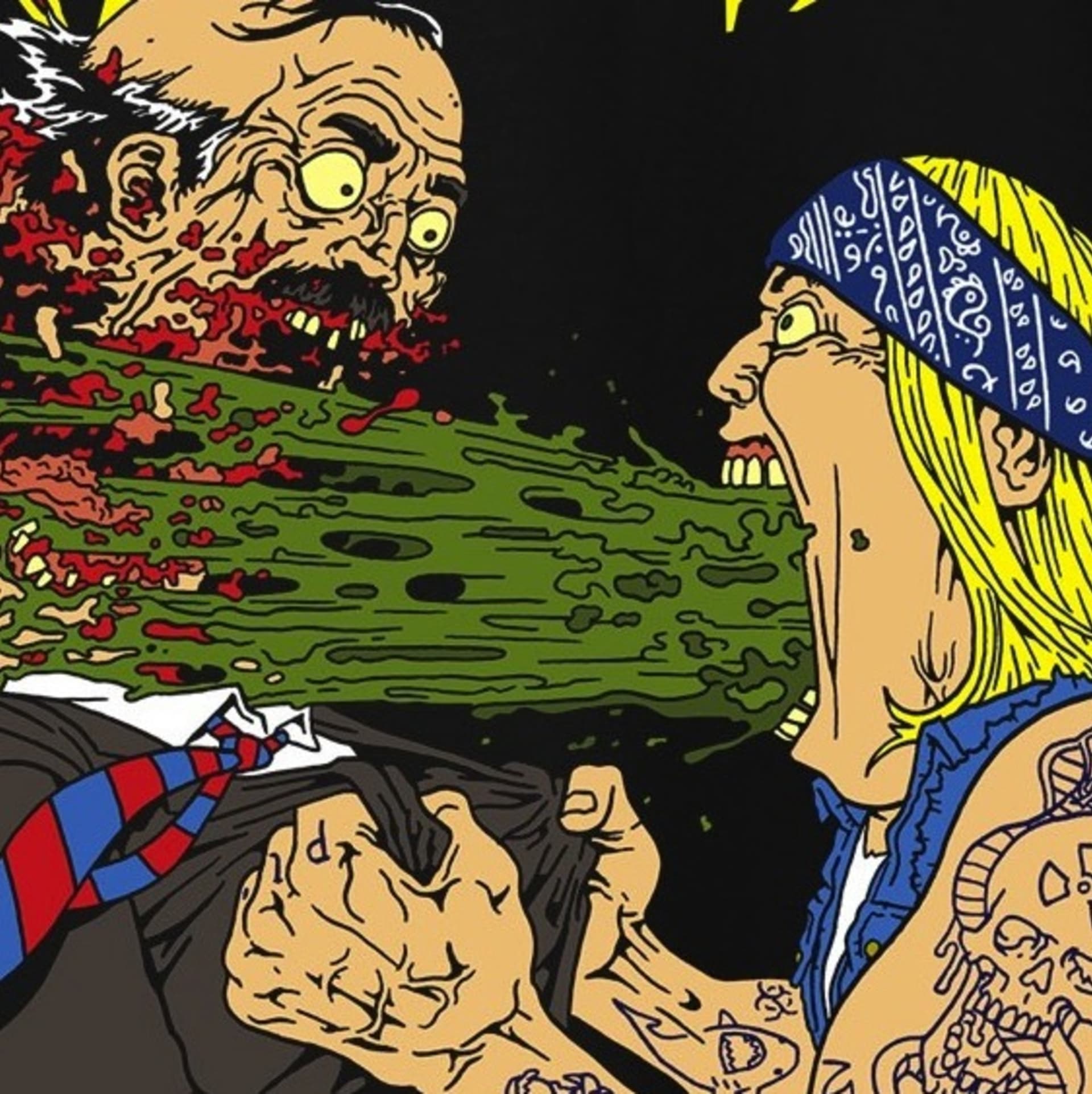 As worn by EB’s head online editor! It’s a speed metal shirt featuring a businessman having his head blown off by a punk’s barf. If this doesn’t do much for you, then I guess you were never 14 and angry. Impressive…